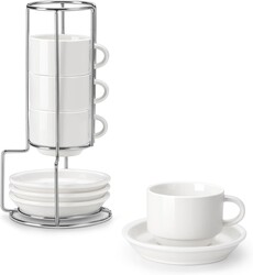 Gomakren 6 Ounce Cappuccino Cups with Saucers and Metal Stand, Stackable Coffee Cup Set of 4, Valentine Porcelain Espresso Cups for Coffee Drinks, Cappuccino, Latte, Americano, Tea, White