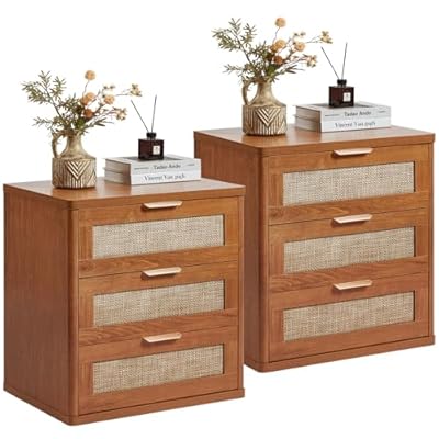 LEYAOYAO Rattan Night Stand with Drawers, 23" Large 3 Drawer Boho Nightstand, Natural Wood Bedside Table Storage Cabinet, Bed Side End Tables Dresser for Bedroom, Living Room, Hallway, Closet