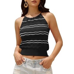 ZAFUL Womens Halter Crochet Tops Backless Sleeveless Hollow Out Summer Sweater Striped Camisole Tank Crop Top